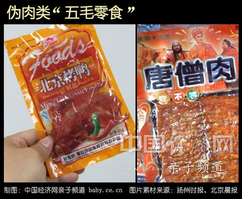 这类“五毛零食”虽然起的是让人联想到肉类食品的名称,实际多为油炸类、膨化类的素食或调味面制食品,“有肉名无肉料”,基本没有什么营养,包装都是油腻腻的。