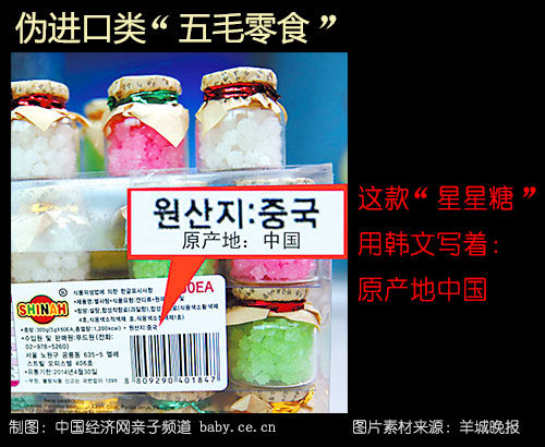 据羊城晚报2012年报道,在广州最大的小零食集散地德路德诚综合市场,该报记者以一名进货商的身份与一家专门批发校门口小零食的商行老板交谈。记者表示自己是在重点小学门口开店,所卖产品要有一定档次,老板递给记者一大盒包装精美的洋糖果。看一下中文标签,上面写着“星星糖”、原产地韩国,进口商是香港的一家公司,代理商则是广州的一家公司。老板称:“这种外国糖果很好卖,很多人来找。有的客人一次就拿一万多元的货。现在的学生很挑剔,不爱买便宜货,专买这些洋糖果。拿货价只要7毛5,你可以卖1块5,也可以卖两块。”
