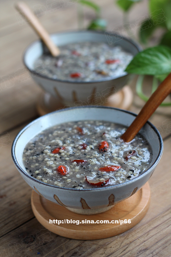 用料:小米70g、糯米30g、黑芝麻20g、红枣4颗、枸杞5g、清水1000ml