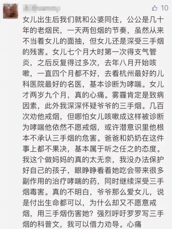 而在我们身边,带孩子时抽烟,或者出去抽完烟就回来抱孩子的人,实在是很多,而给孩子造成的伤害也是特别直接的。比如这个读者无奈的留言: