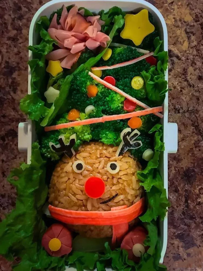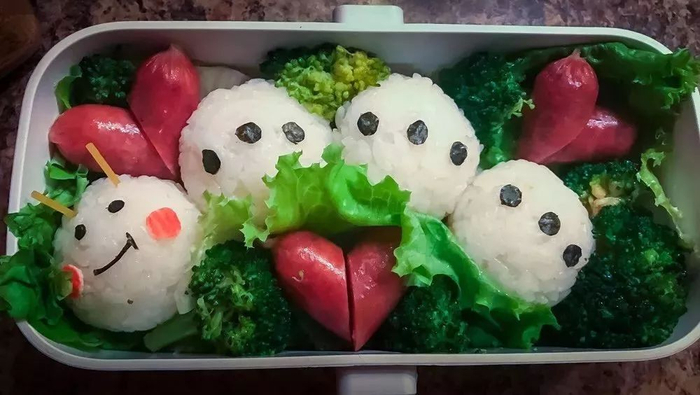 6)饭团上的其它装饰比如火腿片可以用日式蛋黄酱做粘合剂粘在饭团上,饭团和饭团之间需要固定住的话可以用一小段意大利面。我告诉娃说吃的时候取出来不要就可以了,结果有一次大宝居然告诉我她连面条都吃掉了,就是不怎么好吃。😵