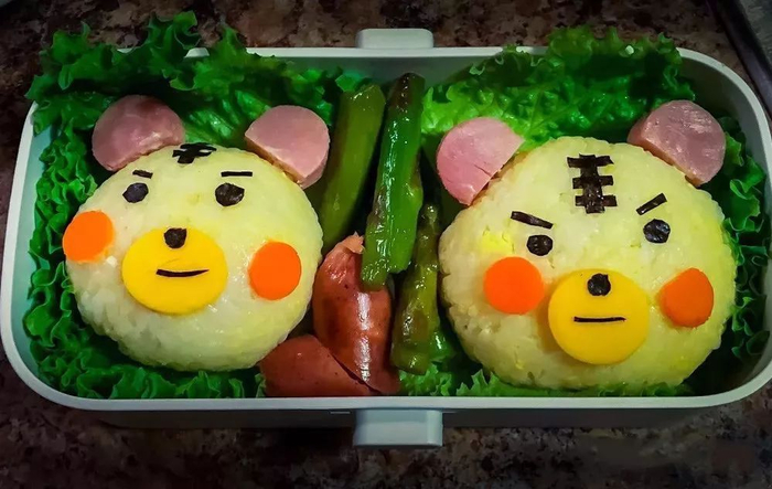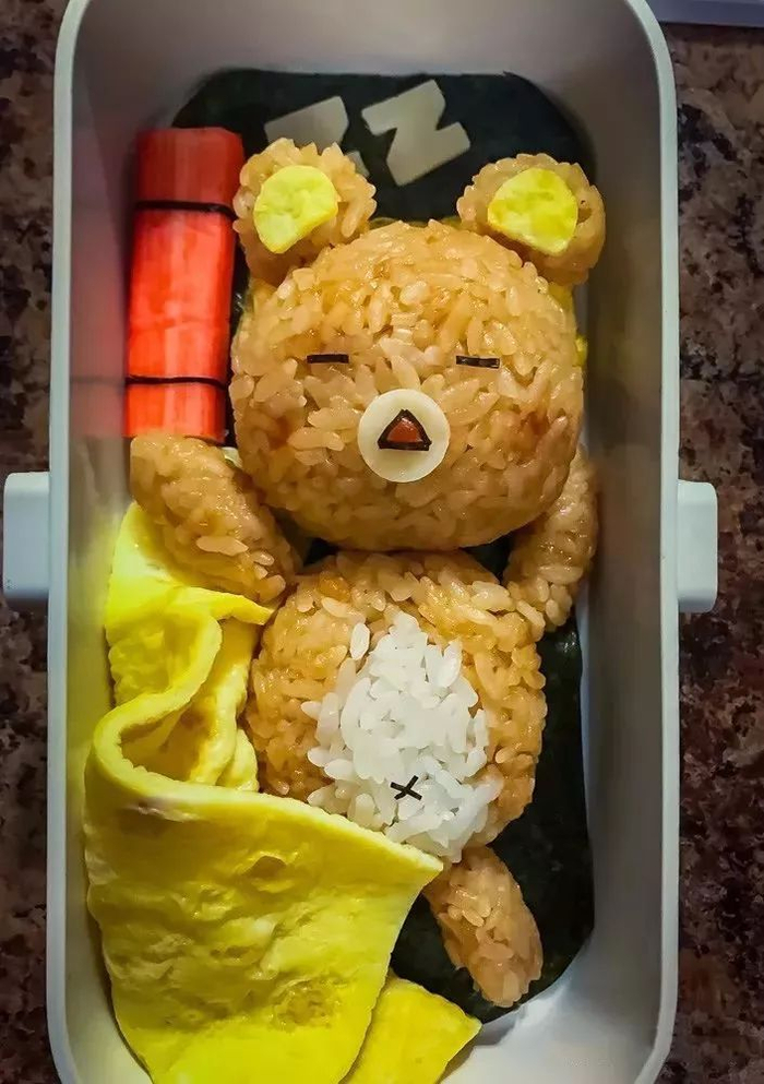 5)米饭和海苔(做寿司那种,不是零食海苔哈)真的是绝配,其貌不扬的饭团加上海苔做的五官立刻就生动起来了,要注意的是海苔遇到水分后会收缩,所以最好等饭团晾凉之后再组装上去。