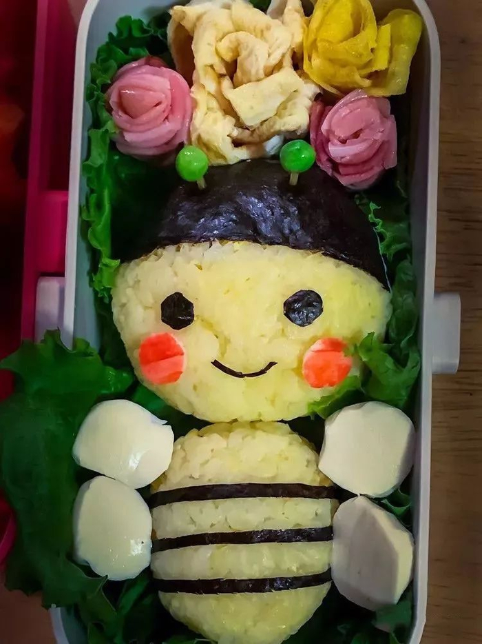 小蜜蜂是用米饭+蛋黄拌匀做的,翅膀用了Mozzarella Ball切半。