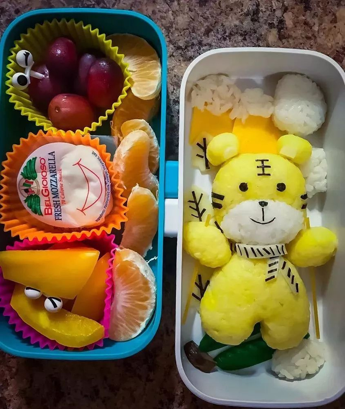 台湾有位妈妈叫珮绮的,特别手巧,好多造型便当我都是跟她学的(她的痞客邦叫“珮绮用心过生活”,存了很多可爱便当的图可供借鉴)。比如踢被子的小熊和爱滑雪的小老虎,都是她的创意哈。