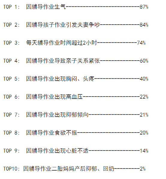 前不久公布的《2018十大辅导作业“后遗症”》中指出,辅导作业引起的劳累过度、夫妻争吵、亲子关系紧张等问题非常普遍。