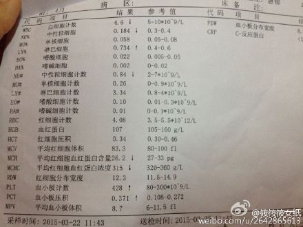 张思莱医师:对于11个月的孩子来说白血球总数并不高,孩子轻度贫血。估计还