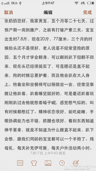 9.@用户:奶奶您好,因为字数多所以发图片了,麻烦您看一下,宝宝各项都很好,就是要还是挺不起来,老人都说是因为我怀孕的时候没有补钙,孩子出生也没给吃钙片导致的,强烈要求我给宝宝吃钙片,经常看您的微博,所以坚持没给宝宝吃,可是又很担心不知道是什么原因,麻烦您解答一下,谢谢