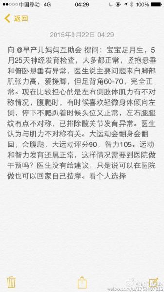 3.@用户:宝宝足月生,5月25天神经发育检查,大多都正常,竖抱悬垂和俯卧悬垂有异常,医生说主要问题来自脚部肌张力高,爱搓脚,但足背角60-70,完全正常。大运动会翻身会翻回,会腹爬,评分90,智力105。发育还属正常,这样需要到医院做干预吗?图片还有详细资料