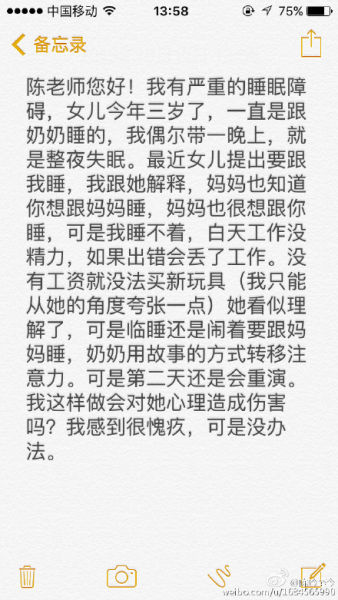 陈禾:爸爸保持热线联系是很有必要的,至少每个星期要和孩子通一次电话,好好听孩子说说话。