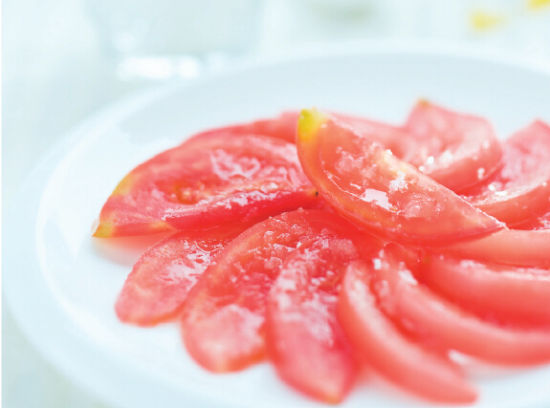 挑选西红柿时,要挑那种软硬适中的,太硬的没有成熟,太软的又不容易切。