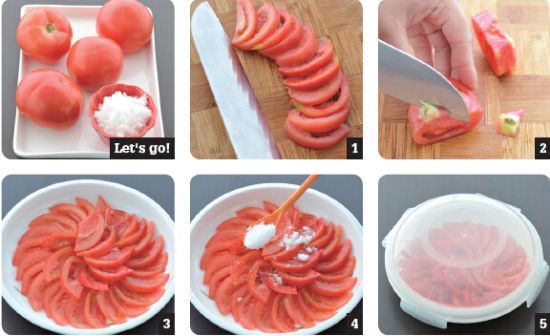 1 1 ~ 2 西红柿清洗干净后去蒂,切成5 毫米厚的片, 3 放入容器中, 4 均匀地撒
