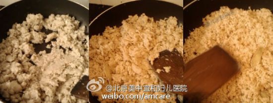5, 开炒啦~跟炒菜差不多,将锅预热,倒入少量油(给宝宝吃可选用橄榄油,少量不粘锅即可),把控干水的鱼肉加入,反复翻炒;直到水分减少,鱼肉慢慢变干;可根据口味再添加酱油、糖等。