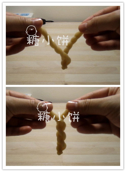 2、取一条搓细搓长,对折,两只手捏着两端,反方向拧出螺旋状