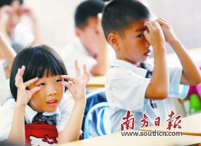 一年级小学生正在跟老师学做眼保健操。南方日报记者 孙俊杰 摄