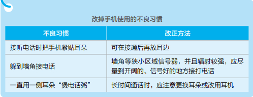 养成良好的使用手机的习惯有助于减轻辐射危害,如尽量让手机远离腰、腹部,不要把手机放在衣服口袋里;晚上手机充电时,不要放在床头;外出时最好把手机放在包里,用耳机来接听。备育男性使用手机时要注意自我保护,身边有普通电话时尽量不用手机,用手机打电话时尽量长话短说。