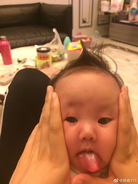 杨威配图照片中,欢欢乐乐脸被捏成各种表情,皱眉的、吐舌头的、瞪眼的,恐怕两宝贝此时的内心os是“好无聊的爸妈,生无可恋!”↓↓↓