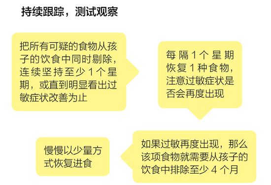找出可疑过敏原后,要进行持续跟踪的测试观察。每次测试只针对1种食物,连续2个星期不要让孩子吃这种食物,并随时记录观察到的情况。一种食物测试完后再彻底更换另外一种,直到把所有可疑食物测试完毕。