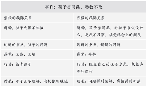 一种是儿子的理解(想象中妈妈抱怨的口气):“我知道你在房间舒服,没啥问题,是我,每次看到你房间,总是觉得乱。我知道房间乱对你不是问题,可对我是,帮我个忙,把房间整理一下好不好?”