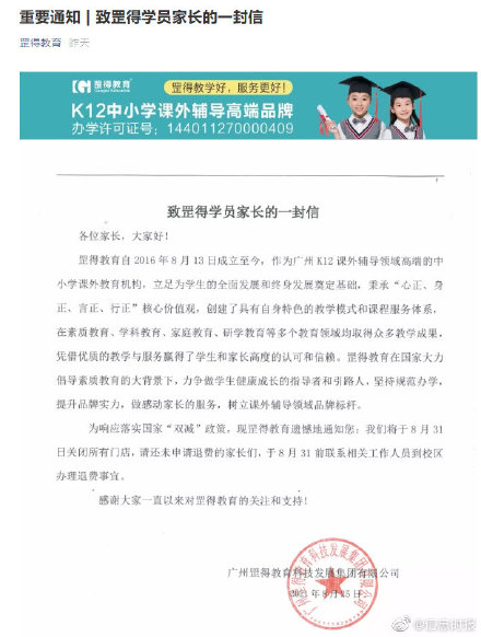 “8月1日,我们开了内部员工会,通知了大家月底结业,让老师们停止接收新学员,停止收学费等等,之后我们再开了家长会,和家长们逐一沟通退费。”