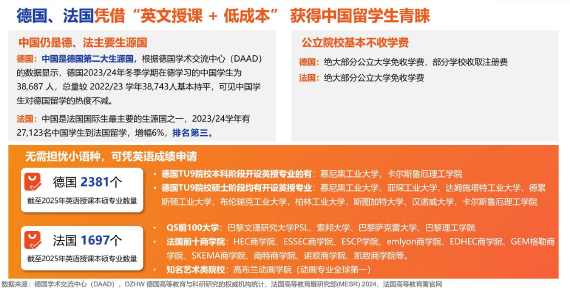 与此同时,欧洲国家也在加快英语授课体系建设。截至2025年,德国提供英语授课的本科和硕士专业已达2,381个,法国则达到1,697个。凭借公立高校较低的学费和扎实的专业实力,法国、德国、荷兰等国吸引了越来越多注重成本效益与专业匹配度的国际学生。