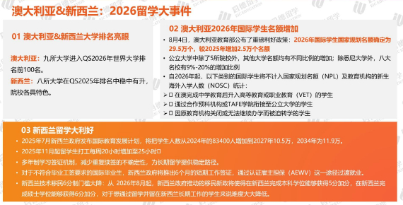 同年8月4日,澳大利亚教育部宣布,2026年国际学生规划名额将增至29.5万个,较2025年增加2.5万个。新西兰则制定了更长期的增长目标:计划将国际学生人数从2024年的83,400人提升至2027年的105,000人,并进一步增至2034年的119,000人。