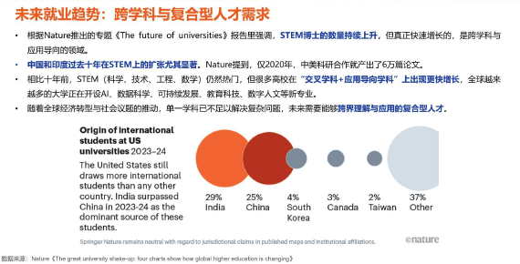 《Nature》关于全球高等教育变革的报道显示,随着经济和文化力量的转移,高等教育的重心也在发生转变。亚洲地区,特别是中国周边及东南亚国家,正逐渐成为新的留学目的地选项。报告强调,尽管STEM博士的数量持续上升,但真正快速增长的是跨学科与应用导向的领域。全球越来越多的大学正在开设如人工智能(AI)、数据科学、可持续发展、教育科技和数字人文等新专业。这些变化背后是全球经济转型和社会议题的推动,未来的竞争力不仅依赖于单一专业,更在于能否跨界整合、应对复杂挑战。