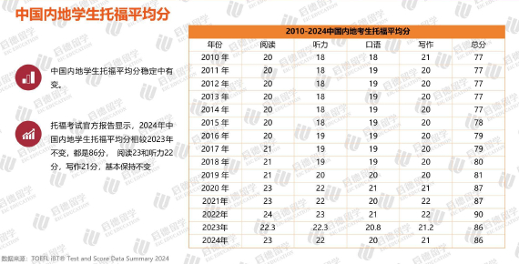 在托福方面,官方报告显示,2024年中国内地考生的平均分为86分,与2023年持平。各单项均分也基本稳定:阅读23分、听力22分、写作21分。