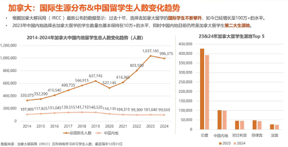 英国高等教育统计局(HESA)的数据表明,2023/24学年期间,英国共接收149,885名中国内地学生,其中本科生和研究生人数分别为65,370人和84,515人。而在加拿大,移民局(IRCC)的数据指出,2024年中国内地赴加留学生人数接近10万。