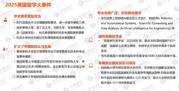 英国方面,80%的合作大学在2025年调整了录取要求,提高国际学生的录取机会;同时,80%的本科课程包含3至12个月的实习安排,部分研究生课程提供6至12个月的带薪实习。加拿大自2024年2月15日起实施毕业工签(PGWP)新政,并在2025年继续执行:完成1年及以上硕士学位课程的国际毕业生,可获得3年工签。