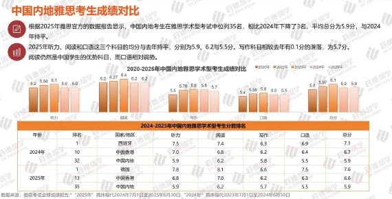 雅思全球官网发布的《2024–2025年全球雅思成绩表现》显示,2025年中国内地考生在听力、阅读和口语三个科目上的平均分与2024年持平,分别为5.9分、6.2分和5.5分;写作科目均分则下降0.1分,为5.7分。其中,阅读仍是中国学生的相对优势项,而口语表现持续偏弱。