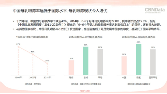 众所周知,母乳是最适合婴儿的食物。而相关研究也显示,母乳喂养不仅为婴儿提供了最佳能量 和营养素的来源,还有益于母亲的健康和福祉。因此,世界卫生组织和儿童基金会建议生命最初6个月应进行纯母乳喂养。不过,《报告》显示,中国母乳喂养率较 低且呈现持续下降趋势。1998年-2014年这16年期间,中国的母乳喂养率从67%下降至28%,中国母乳喂养率不仅低于发达国家,且比38%的国际 平均水平低10个百分点。