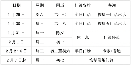 1月31日(除夕)至2月4日(初四):安排上午半日门诊;