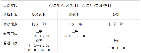 1、肿瘤科门诊、镇痛门诊、血管外科门诊、神经外科门诊、全科医学科门诊出诊时间为2月2日上午半日、2月5日上午半日;