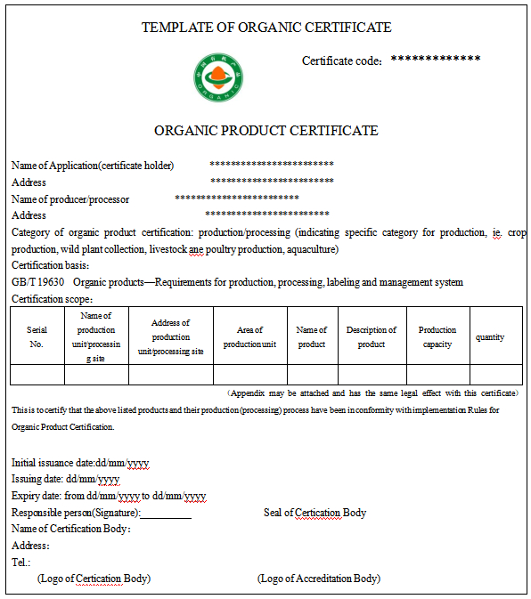 根据《互认安排》,各相关认证机构按照下列样式为输新有机产品获证企业签发英文证书。