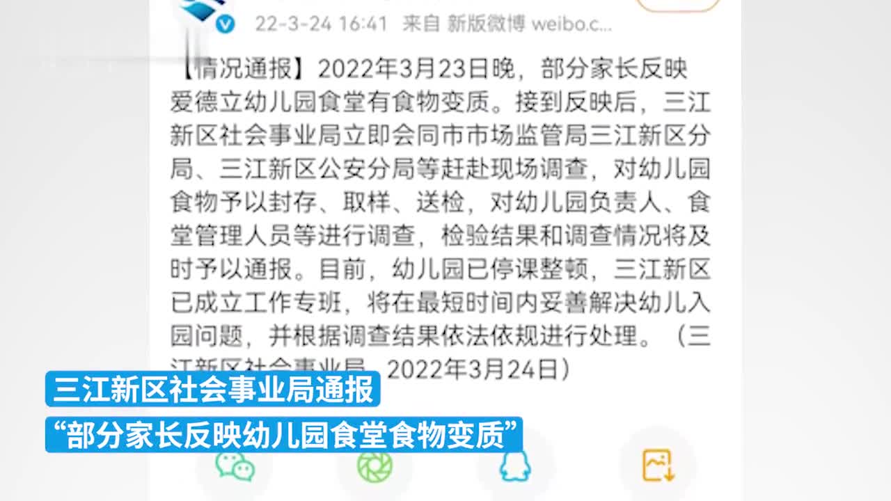 3月24日,四川宜宾。三江新区社会事业局通报“部分家长反映幼儿园食堂食物变质”,已对幼儿园食物封存、取样、送检,调查食堂管理人员。幼儿园停课整顿,成立专班。