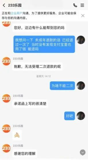 记者联系到233乐园游戏平台的主体公司北京龙威互动科技有限公司,对方回应,经内部核实,家长首次申请退款成功后,账号已关闭充值功能。还有订单未退款是由于家长首次计算退款金额有误,没有一次性申请退款,属于家长遗漏的部分,接到记者反馈后公司已经联系到用户,客服会协助用户补充订单。