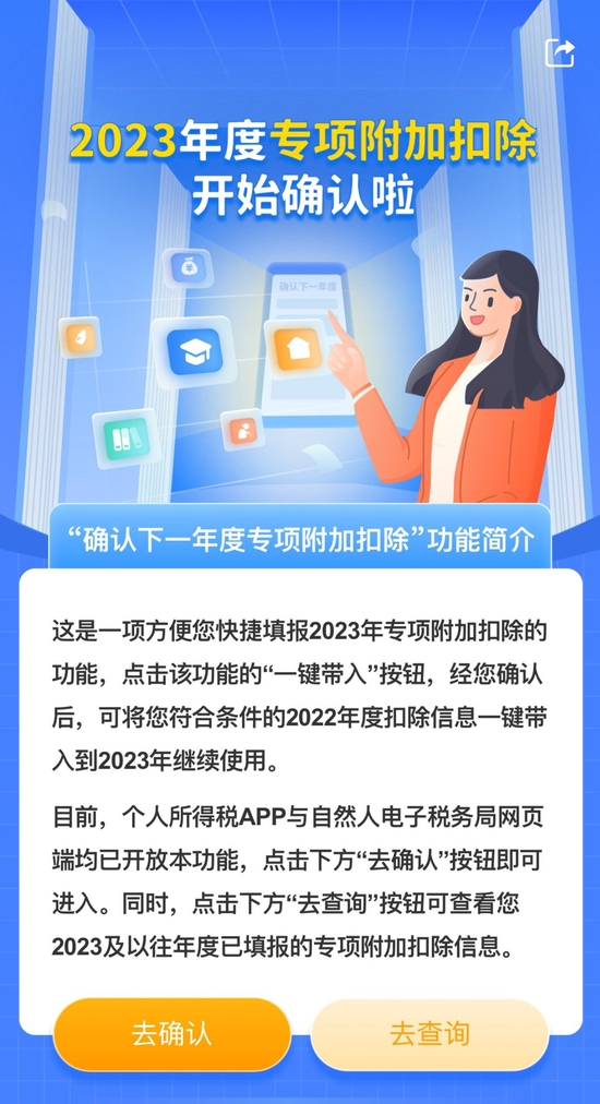 目前,个人所得税APP、自然人电子税务局网页端均已开放相关功能,纳税人点击页面上的“去确认”按钮即可进入。同时,点击“去查询”按钮可查看2023年度及往年度已填报的专项附加扣除信息。