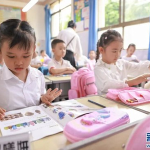 一年级新生翻开新课本阅读。新华网发(陶家淇 摄)