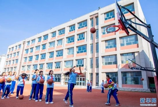 学生在体育课上练习投篮。新华网发(丁根厚 摄)