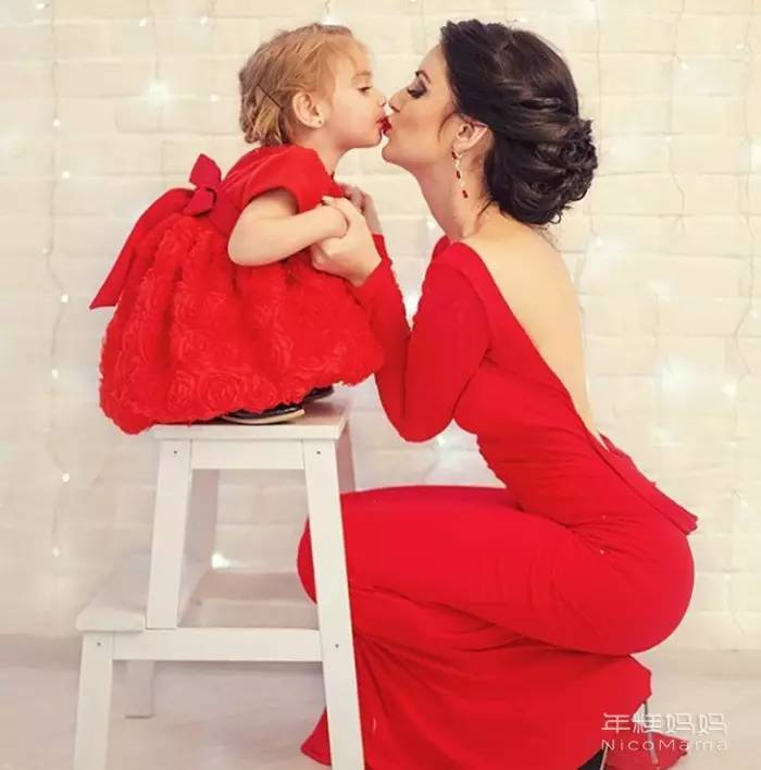 红色长裙配上优雅的复古盘发,妈妈和宝宝都美到爆了。▼