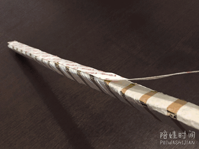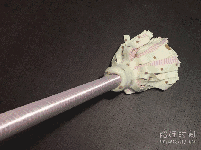 ● 用彩带缠绕在纸棍上,两端打点热熔胶固定(不追求小拖把颜值的亲,可略过此步骤哈)。