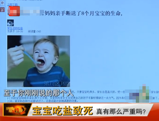 还记得去年的一则疯传的网帖吗?年轻妈妈轻手断送了宝宝的生命,而当时网传的原因是由于这位年轻的宝妈感觉宝宝手脚没力气,无意中听说“小孩子不吃盐就没力气”。于是这位妈妈就给孩子的辅食中加盐,由于加的量比较多,结果引发宝宝高烧,最终治疗无果导致身亡。