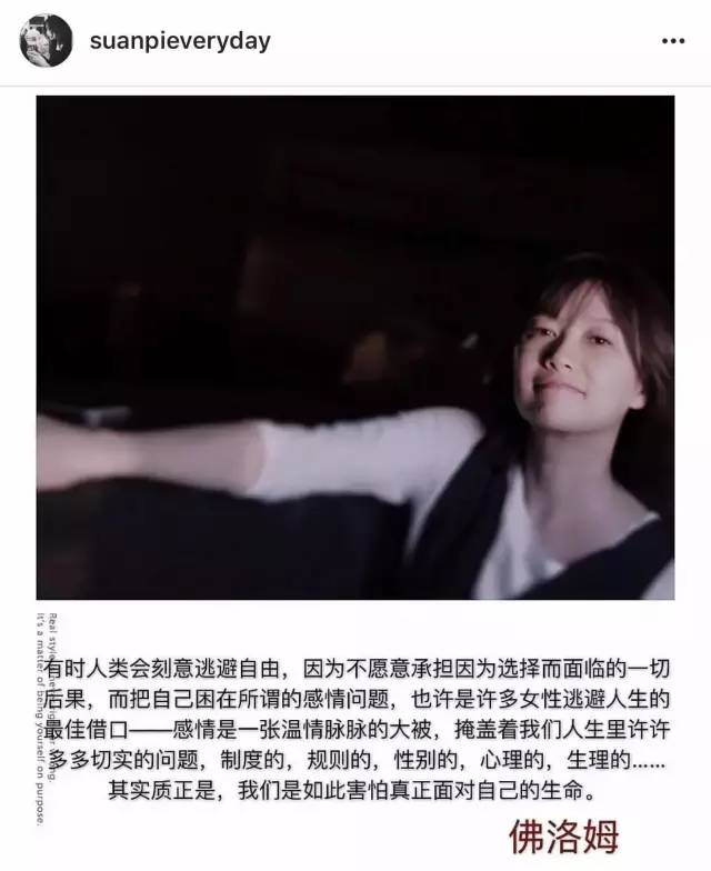 因为初心不一样,很多女孩子不断找爱情,是匮乏;徐静蕾不断找爱情,是因为想了解自己。