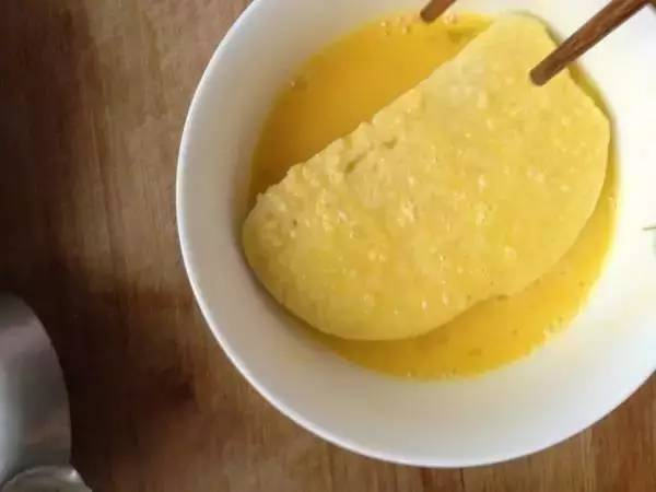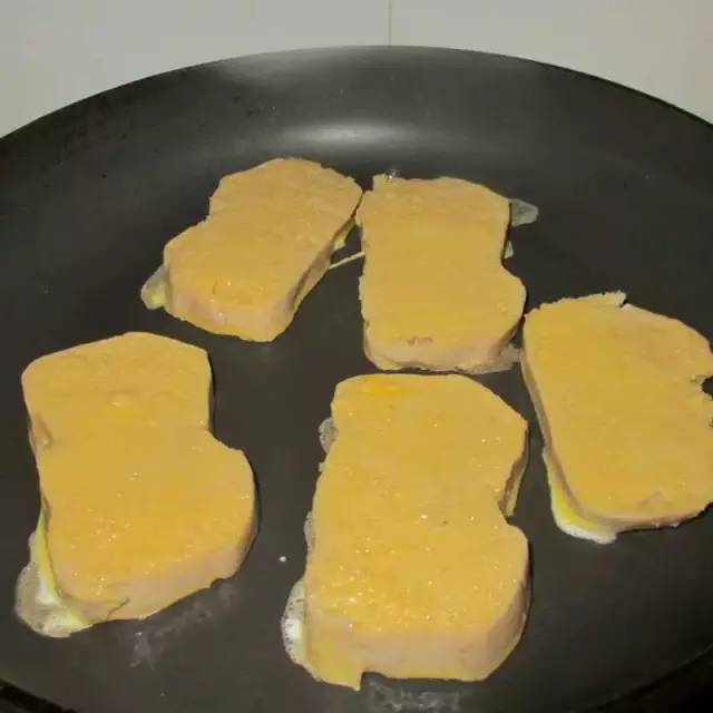 步骤三:把锅中放少许油,将浸泡过蛋液的馒头片放进锅中煎熟,美味的鸡蛋馒头片就完成了!