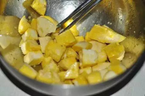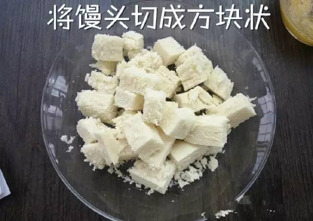 步骤三:把馒头丁放在蛋液中充分混合。