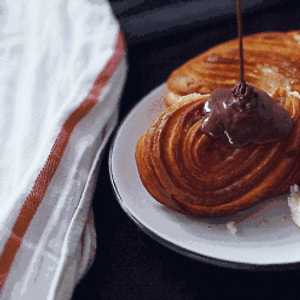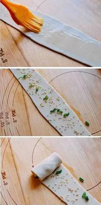 步骤二:发酵好的面团分成小块,擀成长条的面皮刷上有以后,撒上芝麻和葱花,最后卷起来。