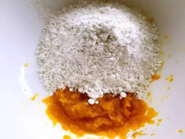 步骤二:将面粉和南瓜蓉揉成面团,色泽为黄色,发酵备用。