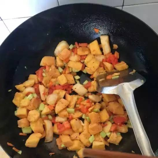 步骤五:在炒好的馒头丁中放进准备好的孜然调料,可以按个人口味加点盐、味精调味,还可以加入蔬菜丁哦!