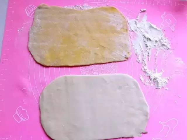步骤三:然后把准备好的两个面团擀成面皮,两个叠在一起卷成条状。