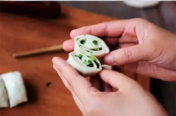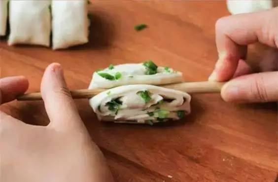 步骤三:把卷好的葱卷两个叠在一起。